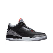 The Jordan 3 Retro "Black Cement" (2018) is a celebrated reissue of the iconic 1988 silhouette. This sneaker features a sleek black leather upper, accented by the signature elephant print on the toe and heel. The white midsole and bright red detailing on the Jumpman logo and eyelets provide a striking contrast, enhancing its classic appeal.